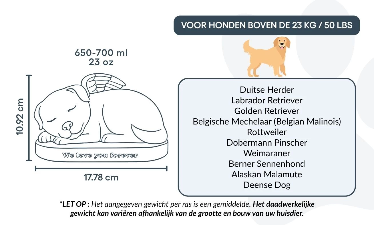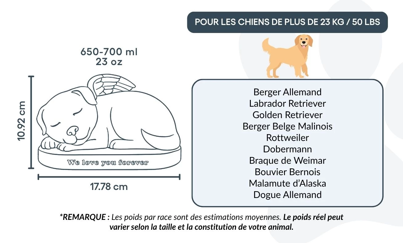 Remarque : la capacité indiquée est basée sur les volumes moyens de crémation. Pensez à tenir compte du poids et de la morphologie de votre animal pour choisir la taille d’urne la plus adaptée.