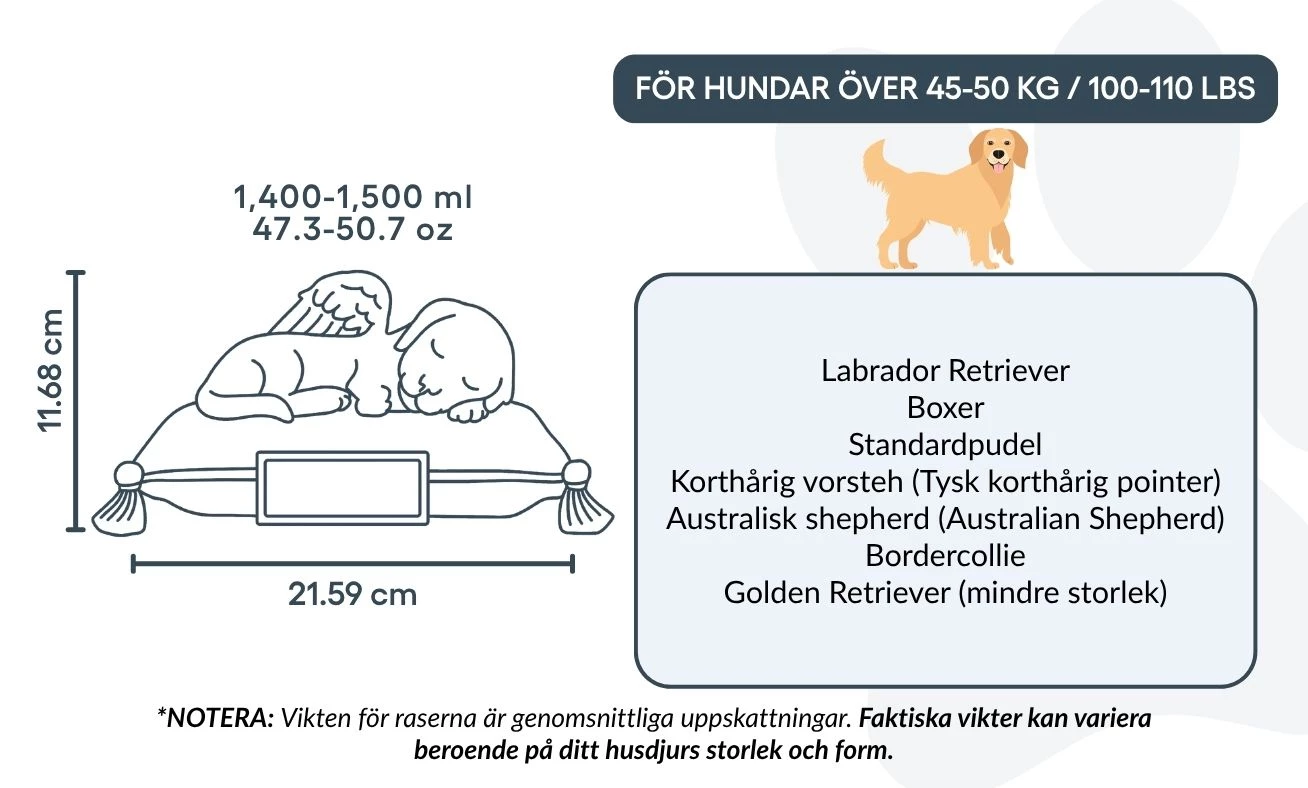 Remarque : la capacité est basée sur des estimations moyennes de crémation. Pensez à prendre en compte le poids et la morphologie de votre animal avant de choisir votre urne.