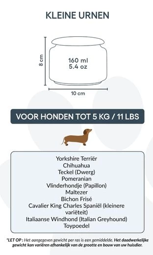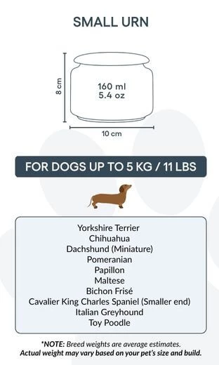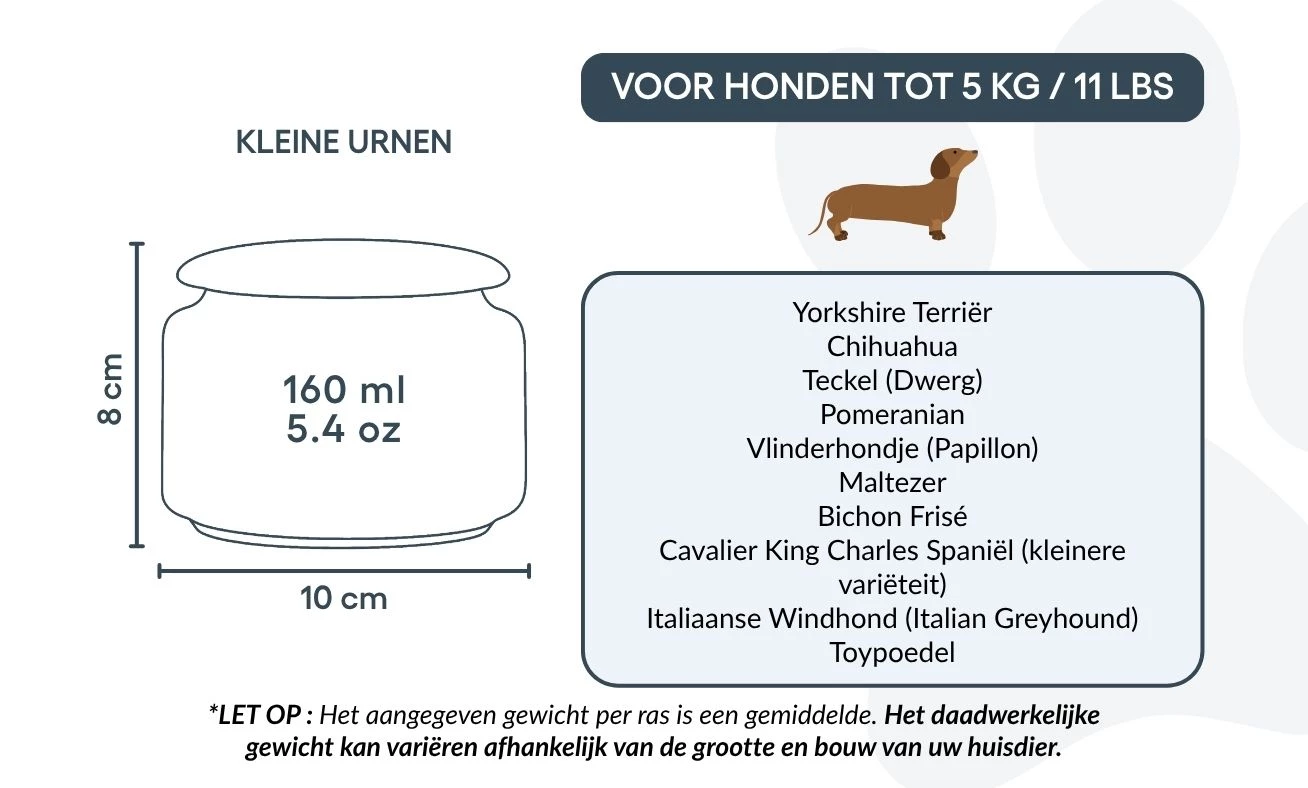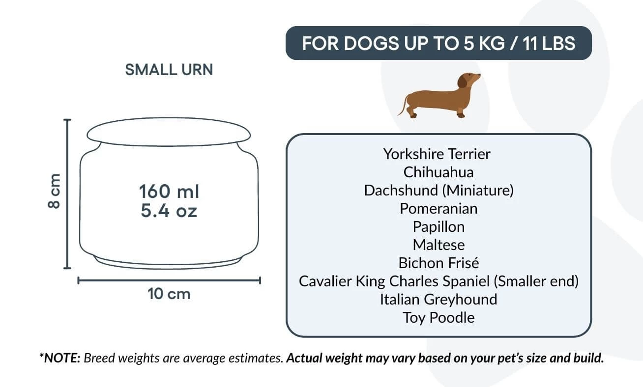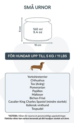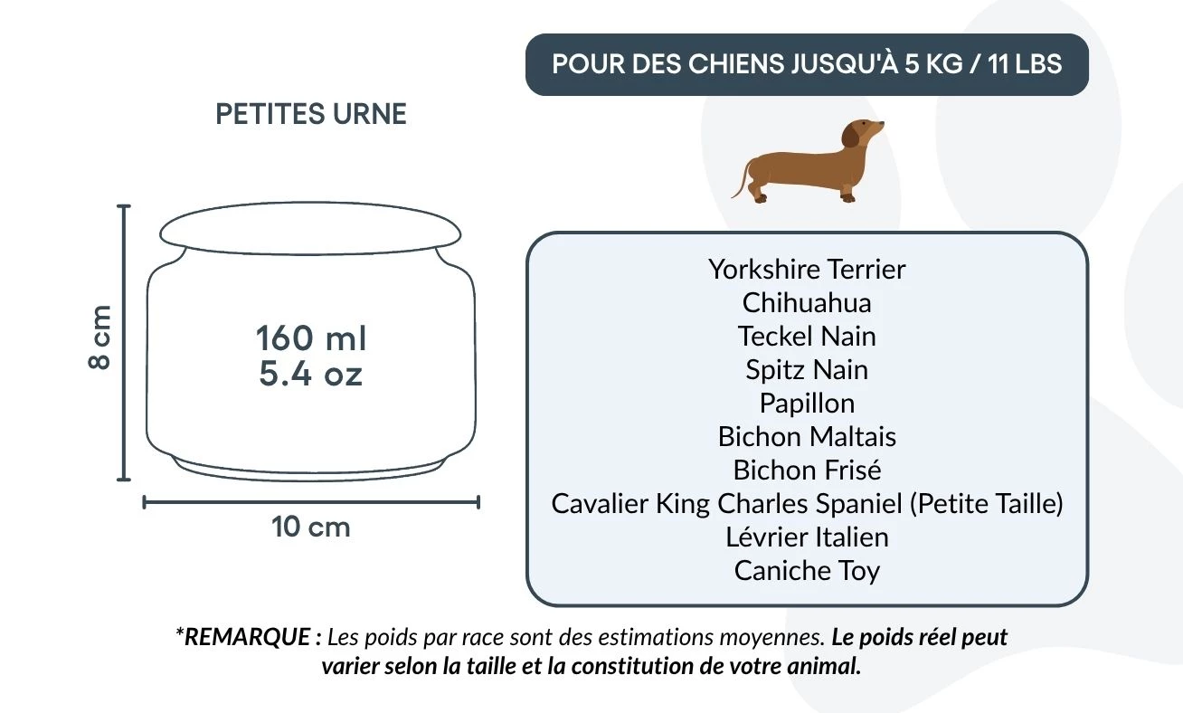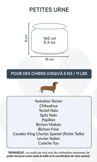 Destinée aux petits chiens jusqu’à 5 kg, cette urne représente un hommage plein de douceur et de respect. Grâce à sa forme épurée et son illustration délicate, elle inspire paix et réconfort dans les moments de souvenir. Elle peut également convenir à ceux qui souhaitent conserver une partie des cendres d’un chien plus grand – pour les partager entre proches ou créer plusieurs souvenirs personnalisés.