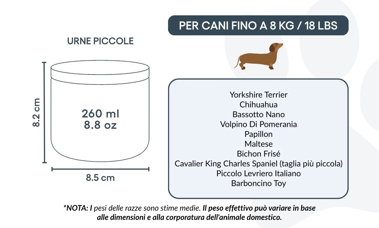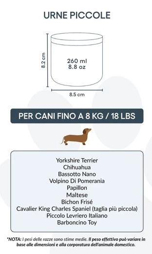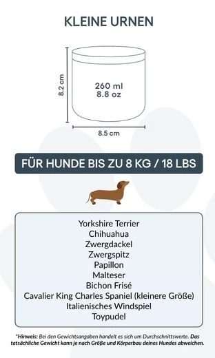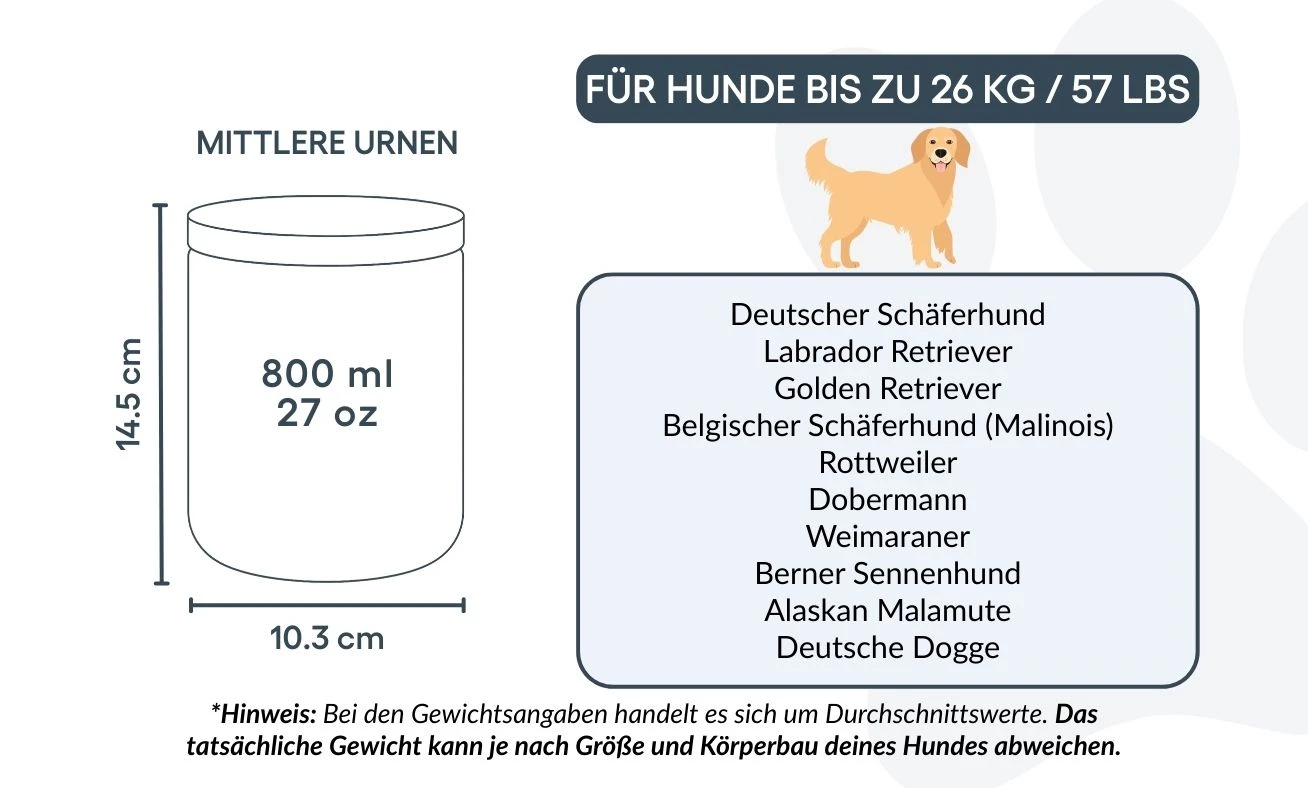 Vous pouvez y ajouter le nom et les dates de vie de votre chien pour en faire un souvenir profondément personnel. Disponible en deux tailles, cette urne funéraire pour animaux convient aussi bien aux petits qu’aux moyens chiens.