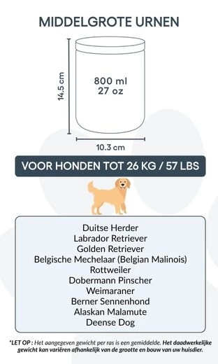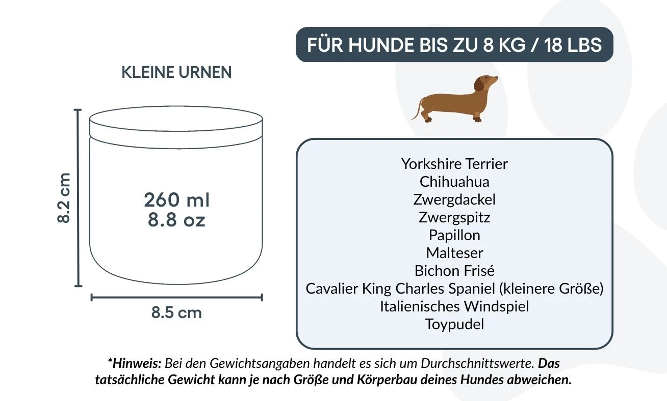 Disponible en deux tailles pour convenir aux petits et moyens chiens, cette urne de crémation est une façon respectueuse et personnelle de dire adieu à votre compagnon. Plus qu’un simple objet, c’est un souvenir durable, conçu pour honorer la fidélité, la tendresse et l’amour partagé.