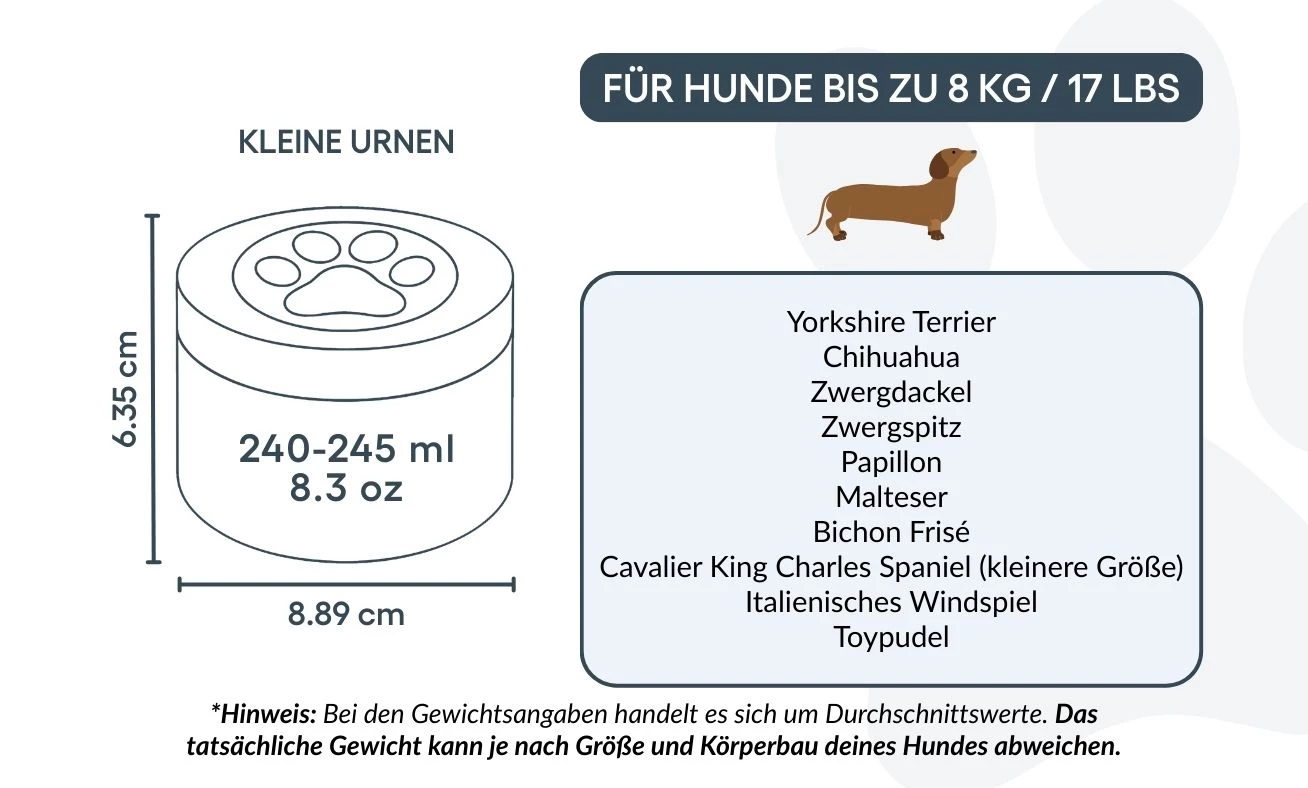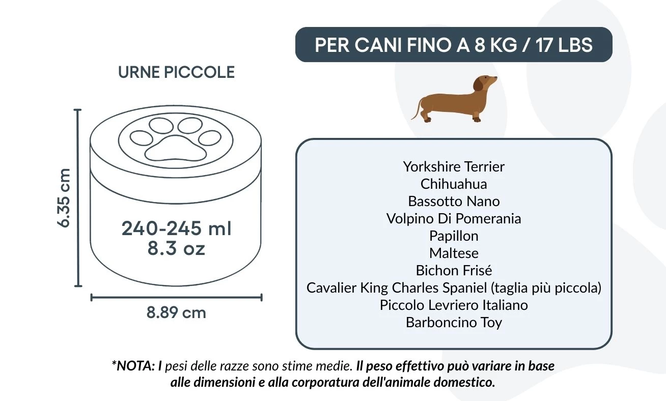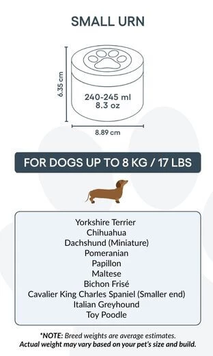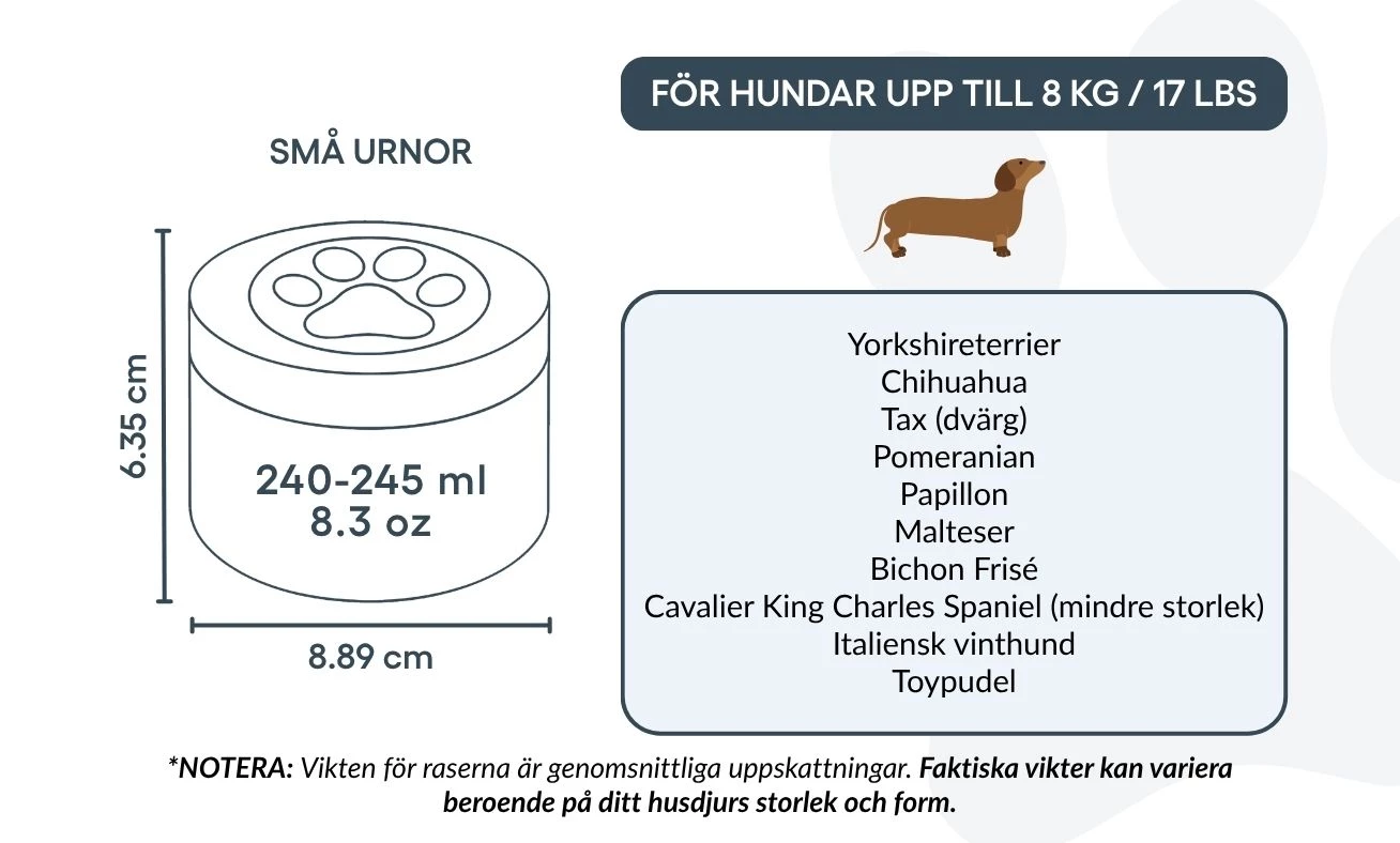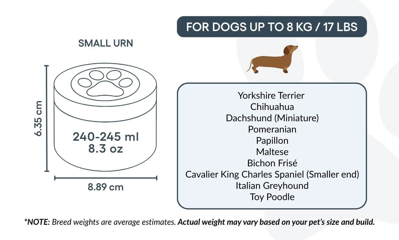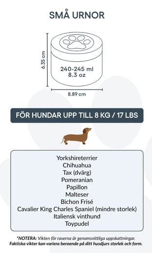 Cette urne pour chien est idéale pour les animaux jusqu’à 8 kg, mais peut aussi convenir à ceux qui souhaitent préserver une partie symbolique des cendres d’un chien plus grand — pour partager le souvenir entre proches ou créer plusieurs souvenirs commémoratifs. Elle permet de garder une part de votre compagnon tout près de vous, de la manière la plus juste pour vous.