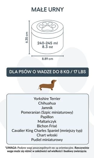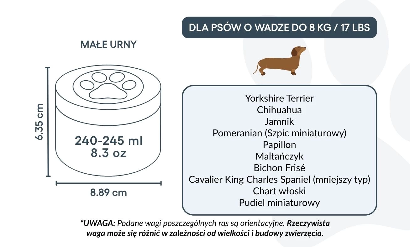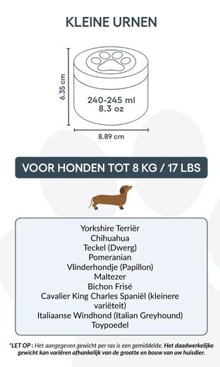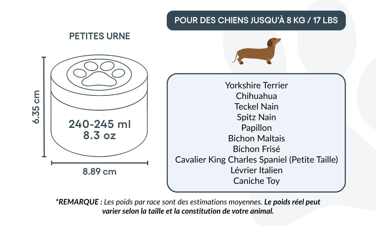 Cette urne commémorative convient parfaitement aux chiens jusqu’à 8 kg, mais peut également être utilisée pour préserver une partie symbolique des cendres d’un animal plus grand — pour partager le souvenir avec vos proches ou créer plusieurs souvenirs personnalisés. Elle permet ainsi de garder une part de votre compagnon tout près de vous, de manière intime et respectueuse.