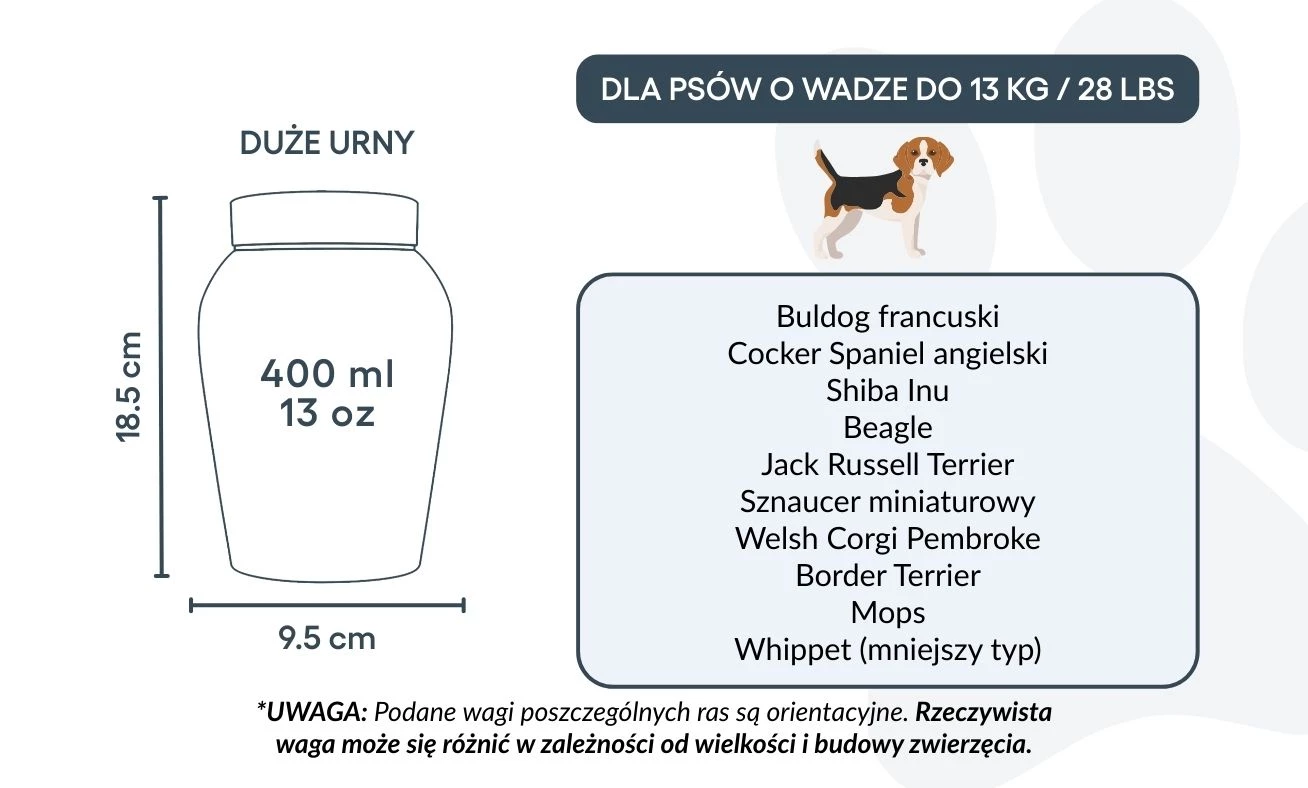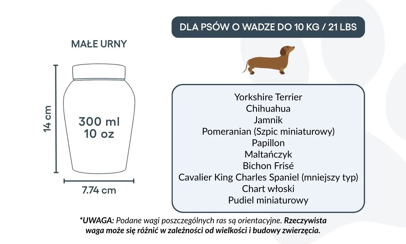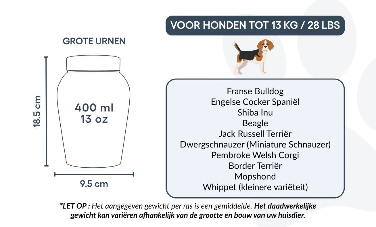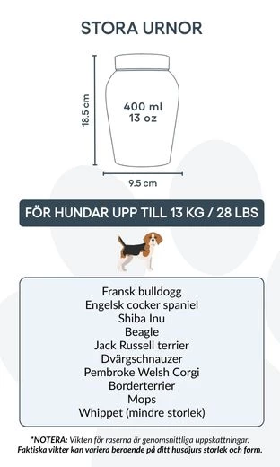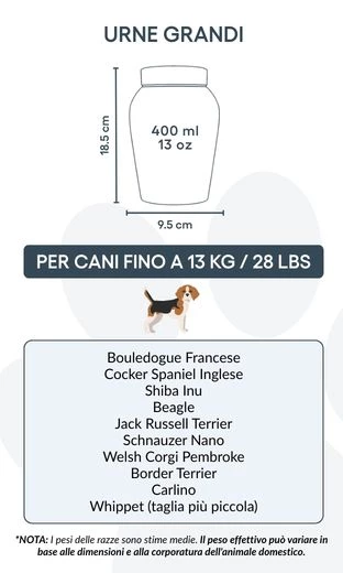 Avec son couvercle sécurisé et sa finition polie, cette urne funéraire est idéale pour conserver les cendres avec respect et sérénité. Proposée en deux tailles, elle constitue un repos digne et personnalisé pour les petits et moyens chiens, tout en restant un souvenir précieux de votre fidèle ami.