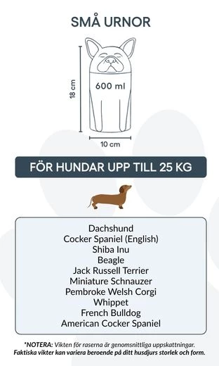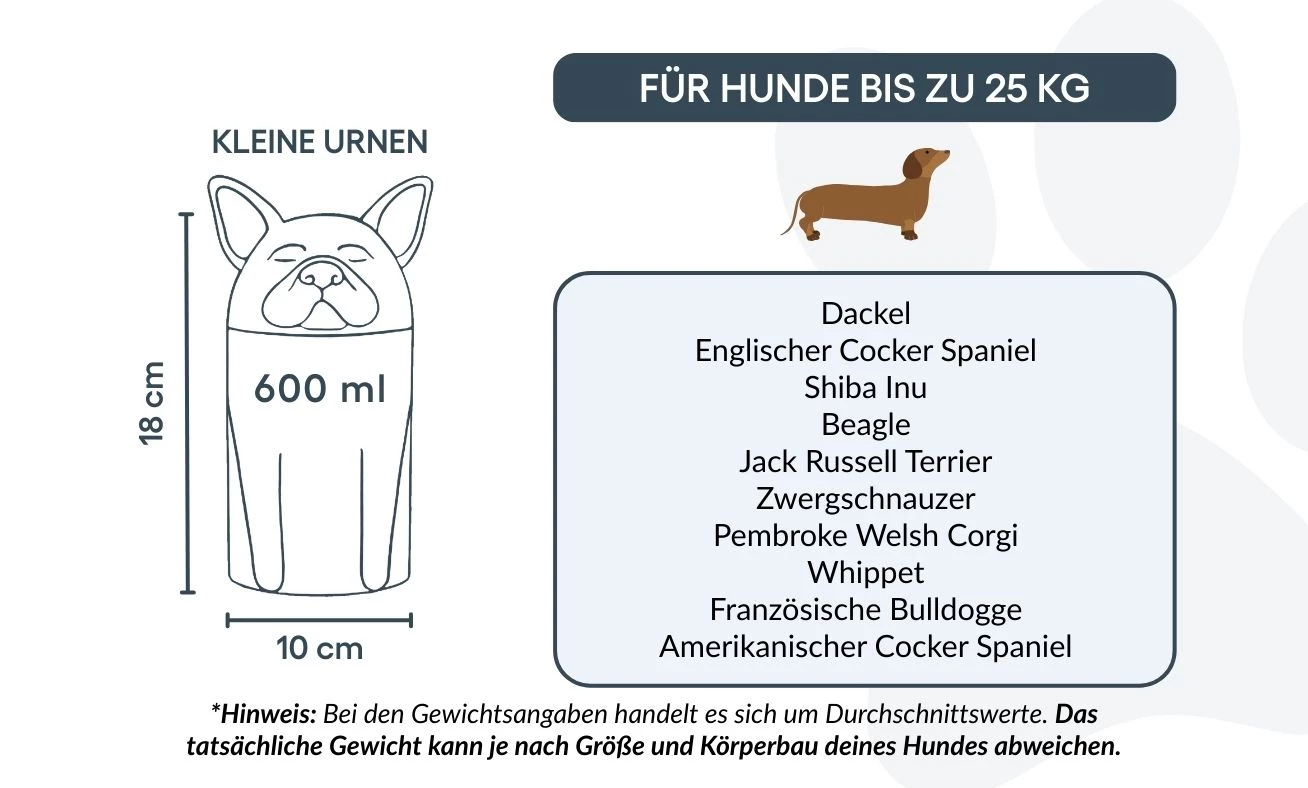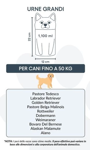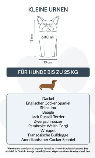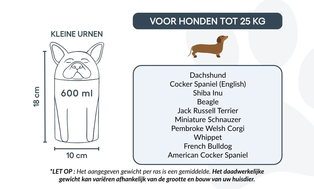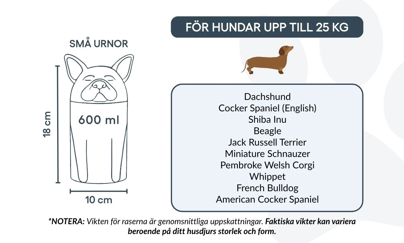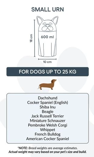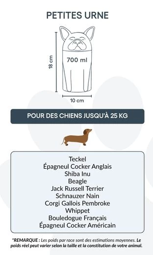 Remarque : les volumes indiqués sont des estimations moyennes basées sur le poids après crémation. Veuillez prendre en compte le poids et la morphologie de votre animal avant de choisir la taille.