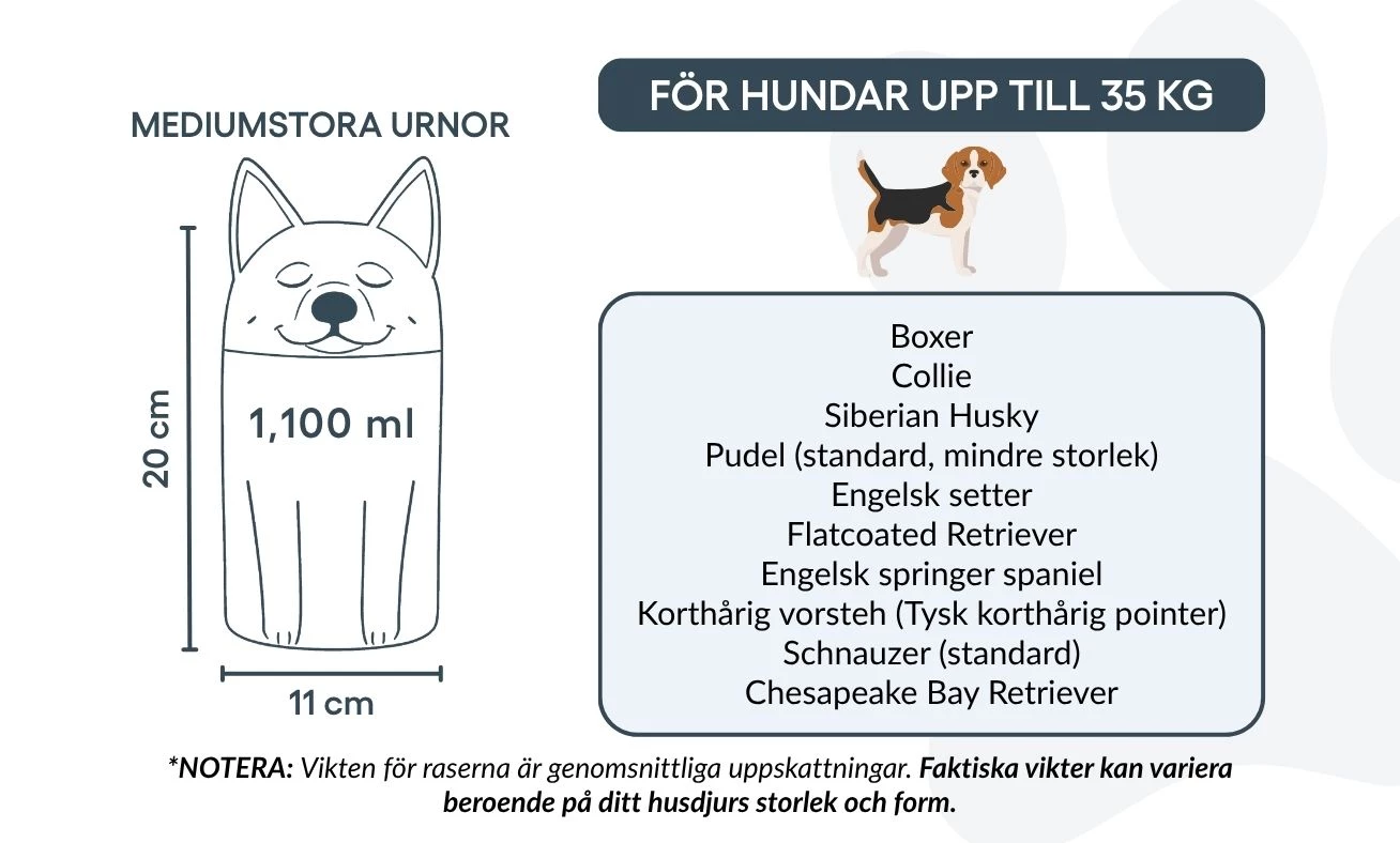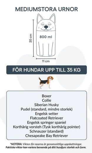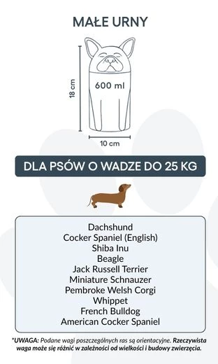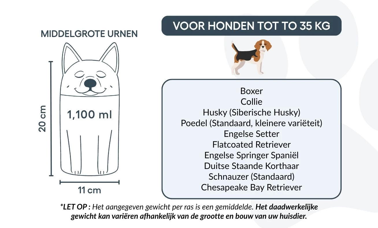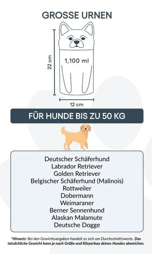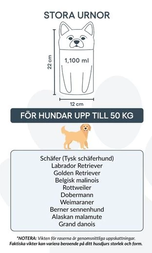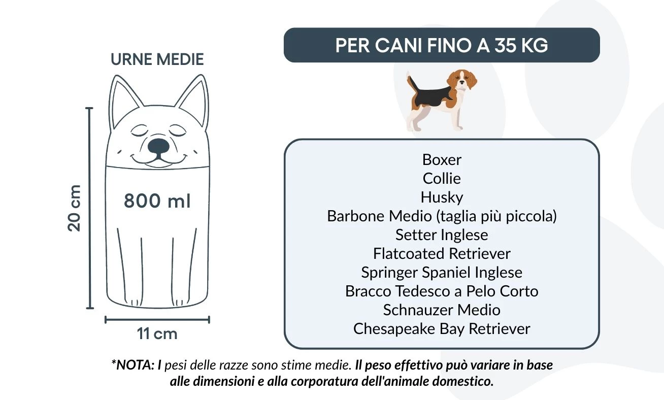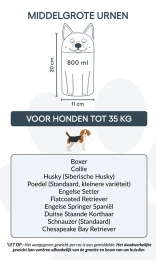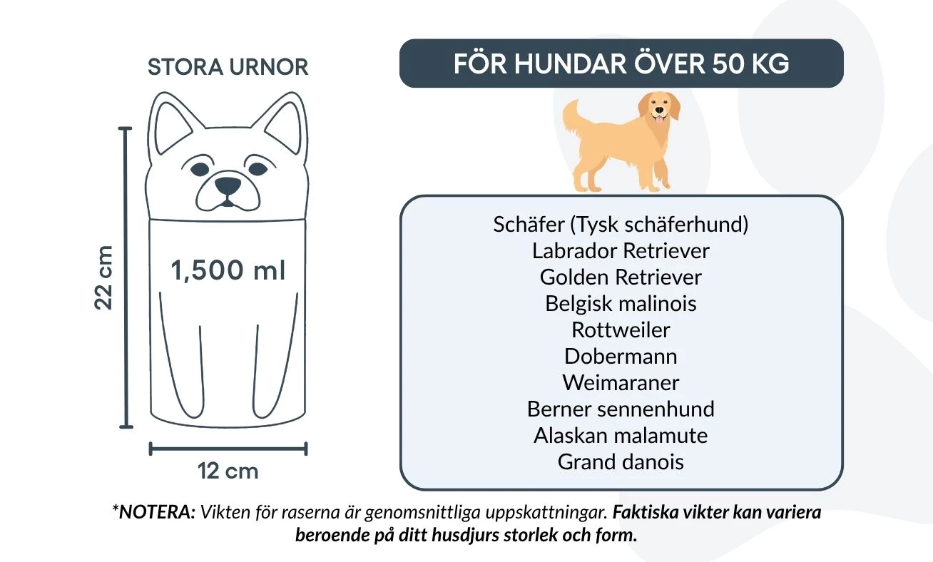Remarque : les volumes indiqués sont des estimations moyennes basées sur le poids après crémation. Veuillez prendre en compte le poids et la morphologie de votre animal avant de choisir la taille.