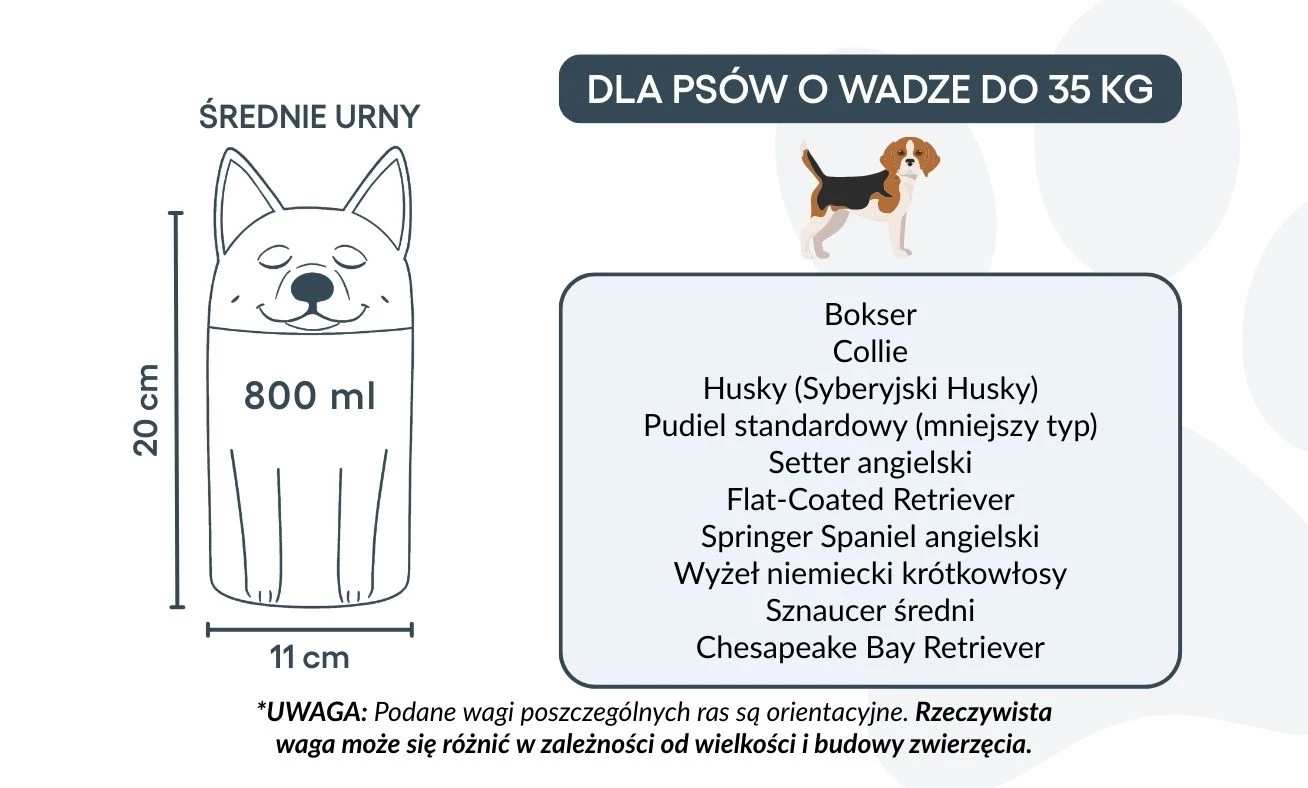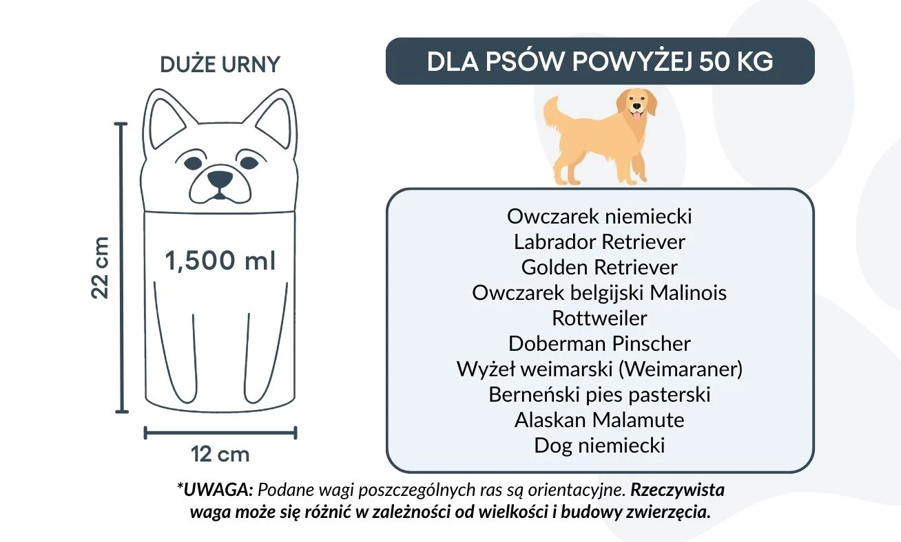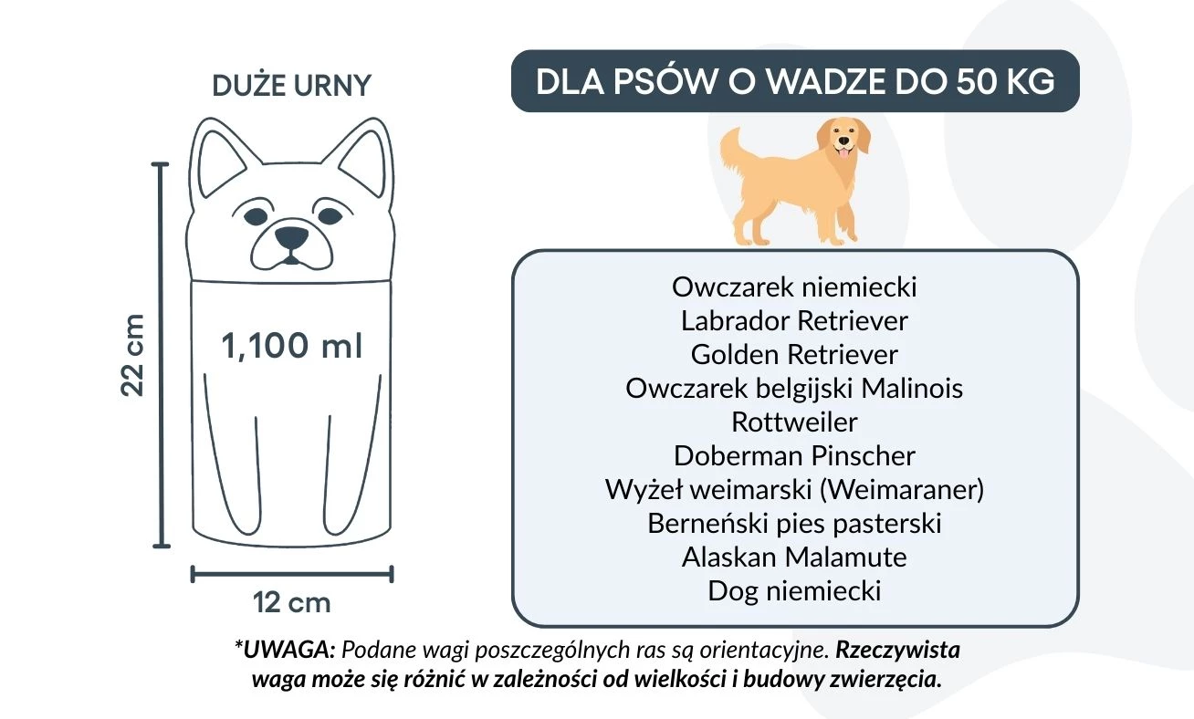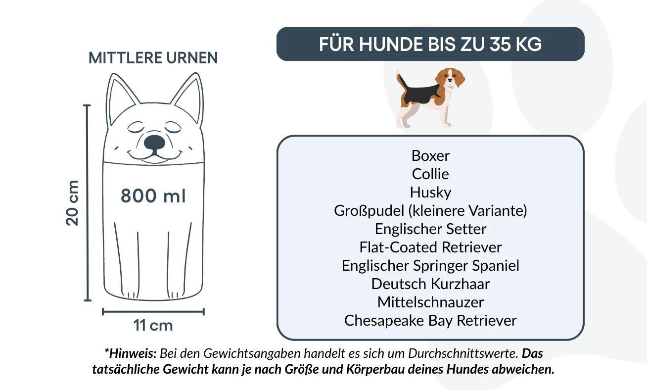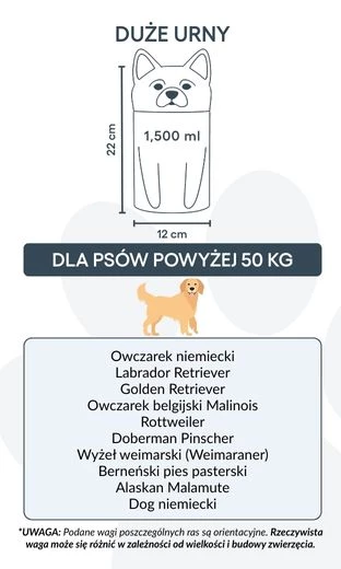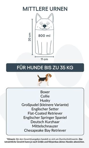 Remarque : les volumes indiqués sont des estimations moyennes basées sur le poids après crémation. Veuillez prendre en compte le poids et la morphologie de votre animal avant de choisir la taille.