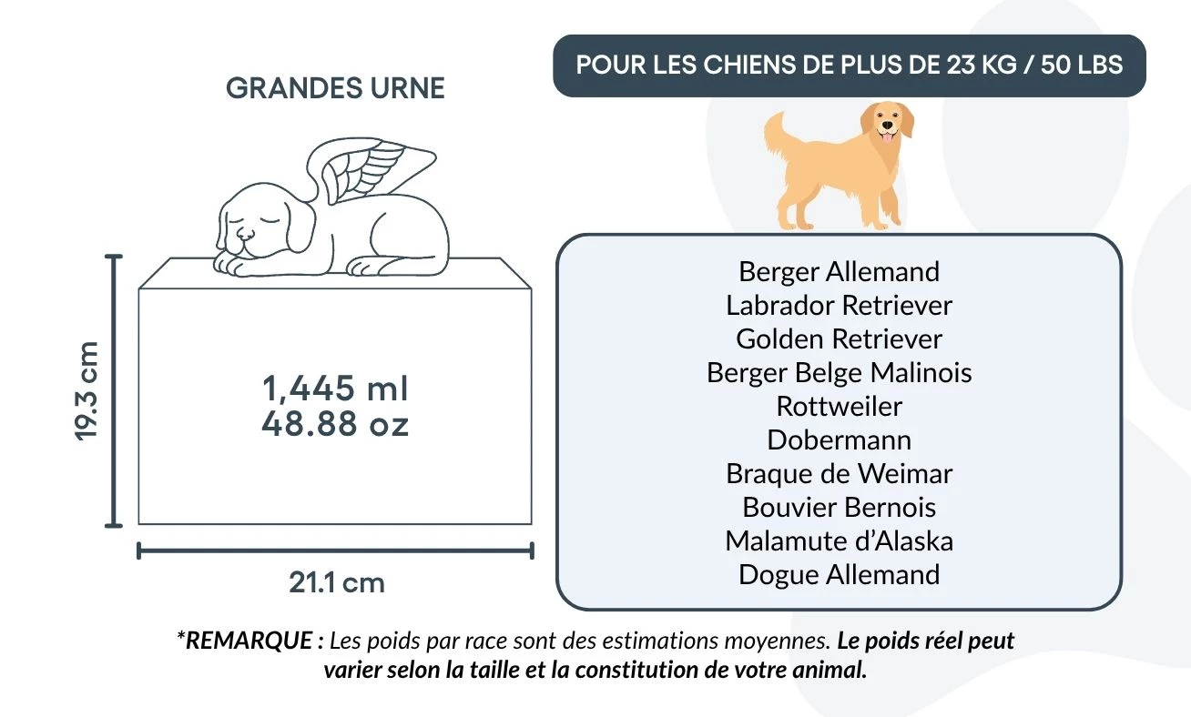 Remarque : les volumes sont des estimations basées sur les moyennes de crémation. Veuillez tenir compte du poids et de la morphologie de votre animal avant de choisir la taille.