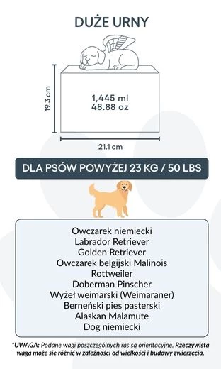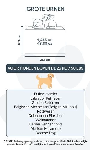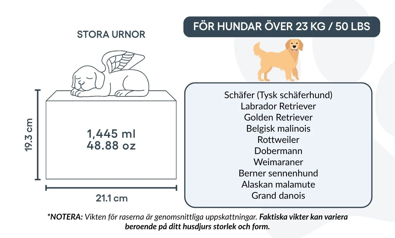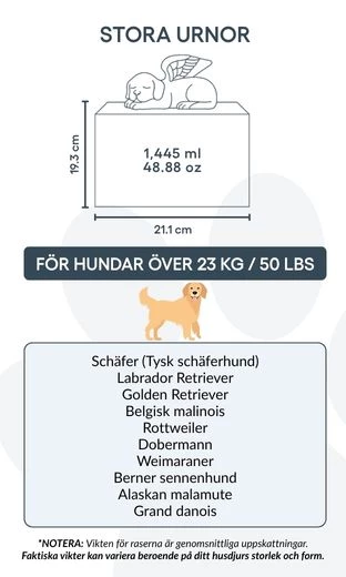 Grâce à sa grande capacité intérieure (~1 445 ml), cette urne en bois convient pour les chiens de taille moyenne à grande. Que vous souhaitiez préserver ses cendres ou simplement lui rendre un hommage plein d’amour, cette urne funéraire personnalisée offre une présence apaisante et respectueuse dans votre foyer.