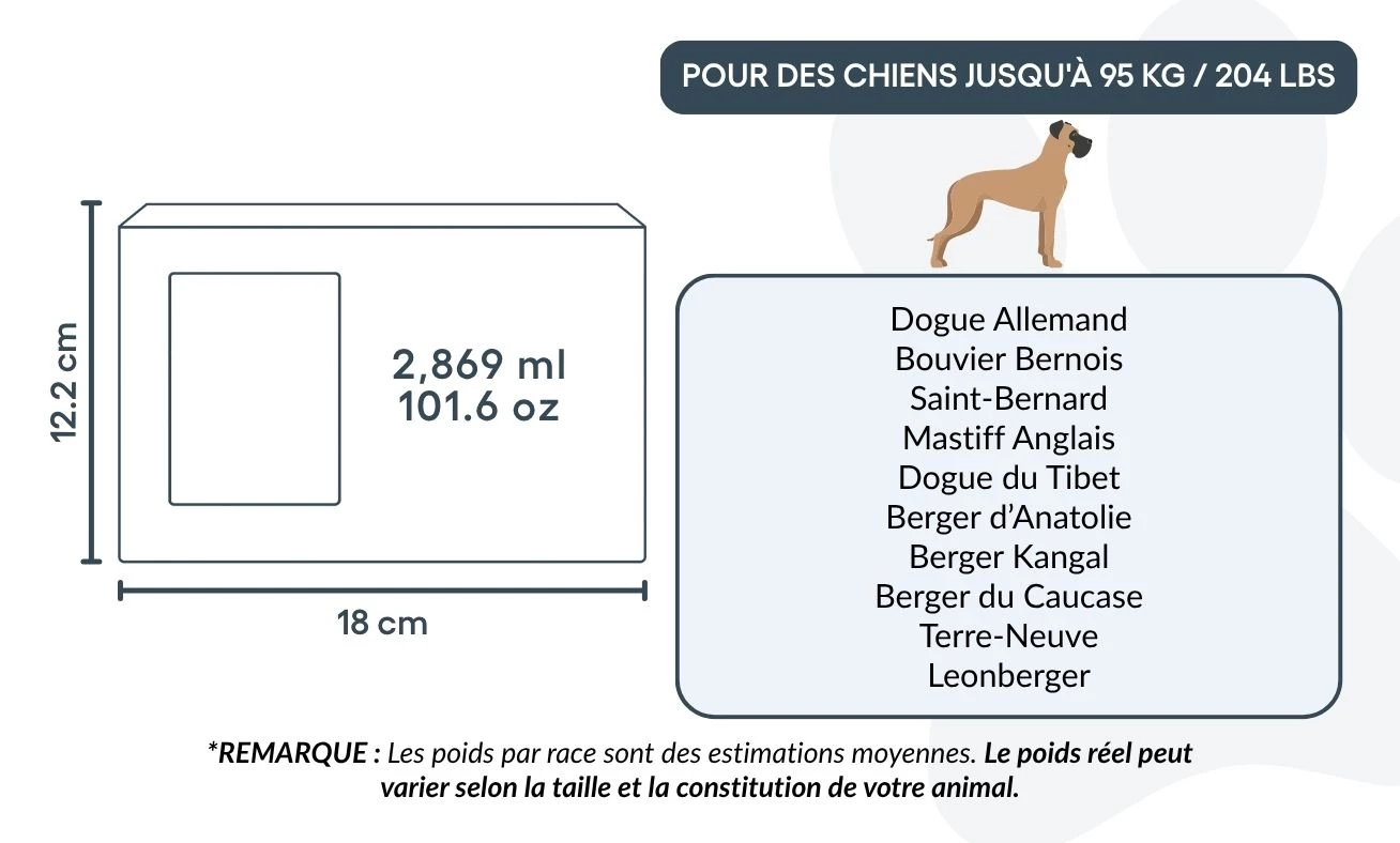 Remarque : les volumes indiqués sont des estimations basées sur les moyennes de crémation. Veuillez tenir compte du poids et de la morphologie de votre animal avant de choisir la taille.